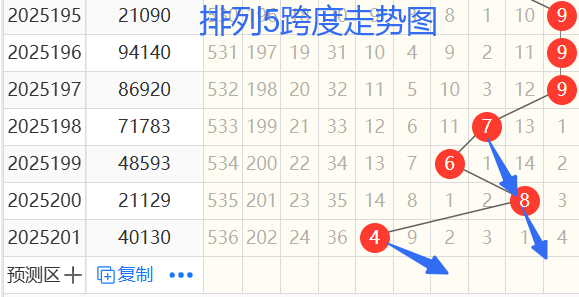 2)我们来看跨度,以197期——201期为例,如图依次是97684跨度,按照012路的排序是01021路跨度,后面两期不是同路跨度,根据路数转换关系来看,本期2 1路跨度,那么跨度我们暂定258147跨,个人比较看好5 6 9 跨度