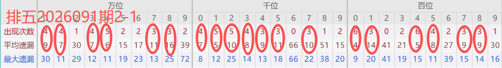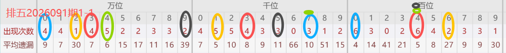 下图所圈出的为近30期各位置所出现的热码出现次数及平均遗漏值,用以参考和一些冷码组合选号。