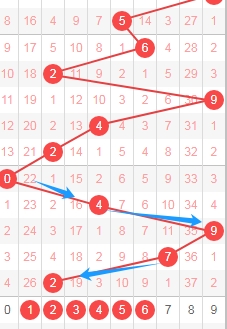 上图是体彩排列五从左到右定位第二位数字,我标志出来的蓝色箭头表示走势跨度,很明显最近3期开出的跨度都是大跨度,那么本期可以关注出小跨度走势的数字012345,个人最看好数字02345。