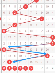 上图是体彩排列五从左到右定位第五位数字,我标志出来的蓝色箭头表示遗漏周期,很明显最近开出的数字遗漏周期大,那么本期可以关注出遗漏周期小的数字034568,个人最看好数字0456。