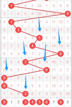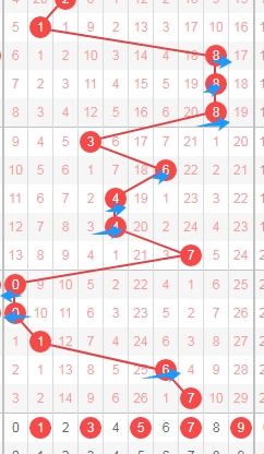 上图是体彩排列五从左到右定位第一位数字,我标志出来的蓝色箭头表示跨度,可以发现最近几期出现了三次跨度五,跨度四走势,那么本期可以关注出跨度小的数字123456,个人最看好数字12356。