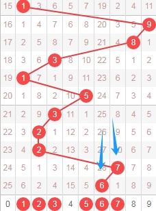 上图是体彩排列五从左到右定位第四位数字,我标志出来的蓝色箭头表示遗漏周期,上期开出数字6遗漏周期是28期,上上期开出数字7遗漏周期是10期,那么本期可以关注出遗漏周期小的数字123567,个人最看好数字12357。
