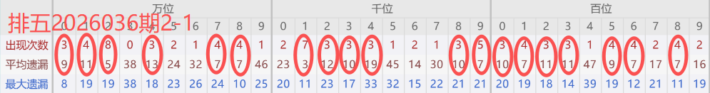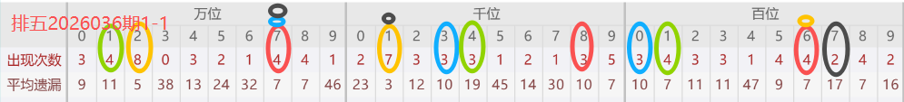 下图所圈出的为近30期各位置所出现的热码出现次数及平均遗漏值,用以参考和一些冷码组合选号。