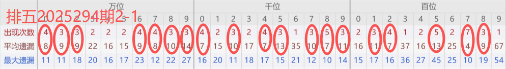 - 各位置出现频率:查看近30期数据,万位0出现4次,千位9出现3次,百位4出现2次,十位4出现3次,个位1出现5次。