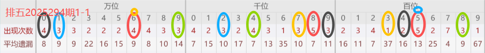 下图所圈出的为近30期各位置所出现的热码出现次数及平均遗漏值,用以参考和一些冷码组合选号。