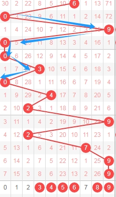 上图是体彩排列五开奖号码从左到右第二位数字,我标注出来的蓝色箭头表示遗漏周期,上期开出数字3遗漏周期是7期,上上期数字9遗漏周期11期,根据这些遗漏周期来分析的话,本期关注遗漏周期小的数字0135679,个人最看好数字13569。
