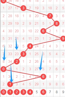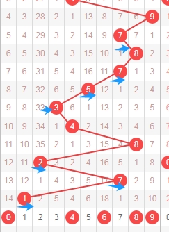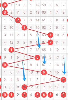 上图是体彩排列五开奖号码从左到右第一位数字,我标注出来的蓝色箭头看看,根据前面的蓝色箭头来分析的话,本期第一位数字可以关注数字345689,个人最看好数字3569。
