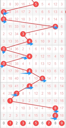 上图是体彩排列五开奖号码从左到右第四位数字,我标注出来的蓝色箭头看看表示质数数字,最近三期又开出了都是质数数字,那么本期可以关注出合数数字04689,个人最看好数字0468。