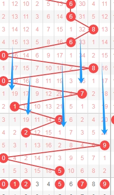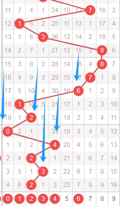 上图是体彩排列五从左到右定位的第五个数字的走势分布图,我在上面画出来的蓝色箭头表示的就是最近开出遗漏周期,你们会发现这些遗漏周期大的比较多,那么本期个人观点就是第五个数字关注遗漏周期小的数字0 1 3 4 7 8,个人看好0 1 4 8。