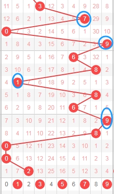 上图是体彩排列五从左到右定位的第三个数字的走势分布图,我在上面画出来的蓝色圈圈表示的就是奇数,上面走势图中标注出来的数字是奇数1 3 5 7 9。最近十几期第三个数字开出的偶数多,奇数少,所以本期第三个数字看好奇数。