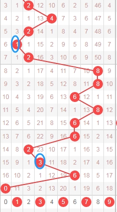 上图是体彩排列五从左到右定位的第一个数字的走势分布图,我在上面画出来的蓝色箭头表示的就是最近开出遗漏周期,你们会发现这些遗漏周期大的比较多,那么本期个人观点就是第一个数字关注遗漏周期小的数字0 1 2 5 7 9。个人看好0 1 2 5 9。