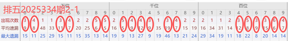 下图所圈出的为近30期各位置所出现的热码出现次数及平均遗漏值,用以参考和一些冷码组合选号。