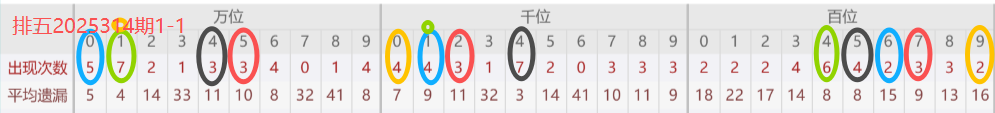 下图所圈出的为近30期各位置所出现的热码出现次数及平均遗漏值,用以参考和一些冷码组合选号。