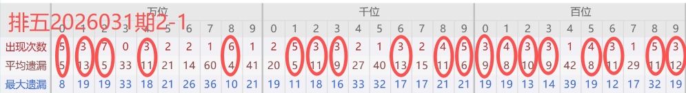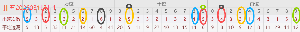 下图所圈出的为近30期各位置所出现的热码出现次数及平均遗漏值,用以参考和一些冷码组合选号。
