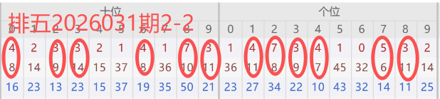 2026027期开奖号码08407,万位近30期0出现5次数 (较029期减一),千位近30期8出现4次数,百位近30期4出现1次数,十位近30期0出现4次数 ,个位近30期7出现5次数 。