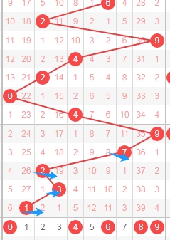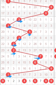 上图是体彩排列五从左到右定位第五位数字,我标注出来的数字都是跨度小的数字,我标注出来的蓝色箭头表示跨度,最近两期开出的跨度都是6属于大跨度,那么本期可以关注出小跨度的数字0123456,个人最看好数字02456。