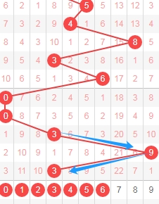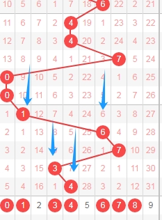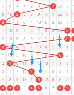 上图是体彩排列五从左到右定位第三位数字,我标注出来的数字都是遗漏周期小的数字,我标注出来的蓝色箭头表示遗漏周期,上期开出数字4遗漏周期是7期,本期关注遗漏周期小的数字0134678,个人最看好数字0178。