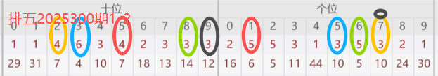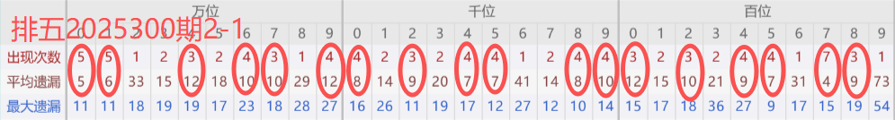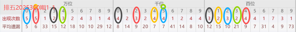 下图所圈出的为近30期各位置所出现的热码出现次数及平均遗漏值,用以参考和一些冷码组合选号。
