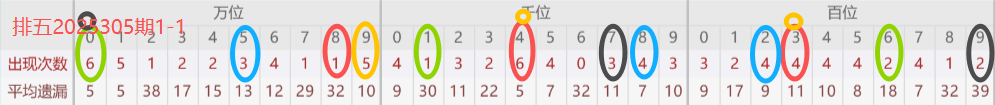 下图所圈出的为近30期各位置所出现的热码出现次数及平均遗漏值,用以参考和一些冷码组合选号。