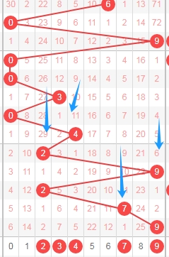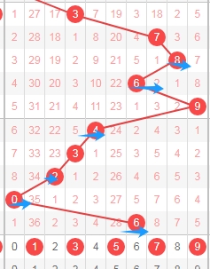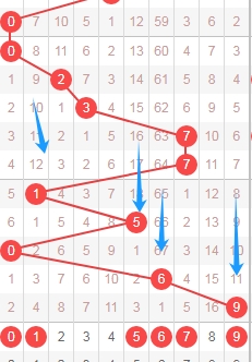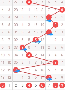 上图是体彩排列五从左到右定位第一位数字,我标注出来的蓝色小箭头是遗漏周期,根据这些遗漏周期来分析的话,第一位数字可以关注出遗漏周期小的数字23479,个人最看好数字2379。