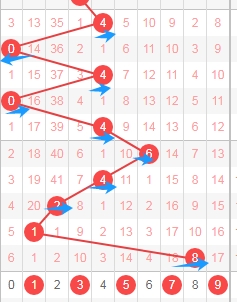 上图是体彩排列五从左到右定位第四位数字,我标注出来的蓝色小箭头是质数数字,很明显最近开出的质数数字多,那么本期第四位数字可以关注出合数数字04689,个人最看好数字0489。