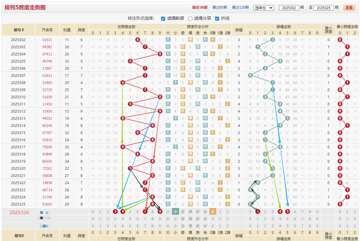 回顾上期开奖83603,合质合合质,质合比2:3,偶奇偶偶奇,奇偶比2:4,大小大小小,大小比 2:3,和值20,跨度8。