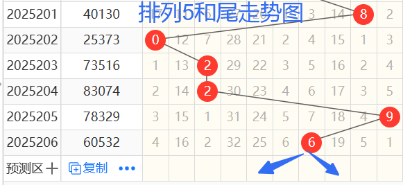 1)我们来看和尾,以202期——206期为例,如图依次是02296和尾,按照012路排序是02200路和尾,后面两期是同路,今天就是1路或2路的和尾,为什么这么讲呢,这个是个大概率的问题,也是根据长期的研究规律定的,准确率相当高,我们定了1 2路的和尾,也就是147258和尾,那么我们再来看和值,按照和值除3余数的话,可以分为余0 1 2路. 那么我们来看和值余数:202期和值20余2,203期和值22余1,204期和值22余1,205期和值29余2,206期和值16余1,结合路数关系来讲,所以和值可余1和余2,结合上面的和尾的话就只有147258尾, 这几个尾数。和值的话就是11 14 17 22 25 28 31 34 37 32 35 这几个和值。