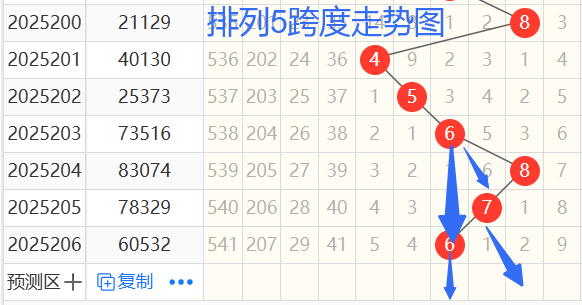 2)我们来看跨度,以202期——206期为例,如图依次是56876跨度,按照012路的排序是20210路跨度,后面两期不是同路跨度,根据路数转换关系来看,本期0 1路跨度,那么跨度我们暂定369147跨,个人比较看好 6 8 跨度