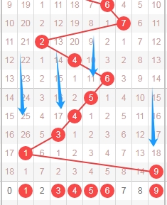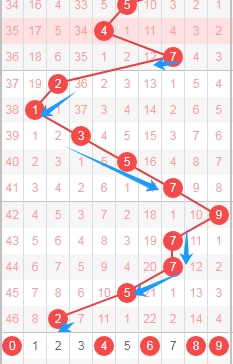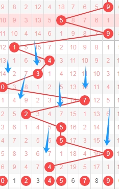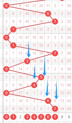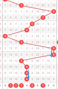 上图是体彩排列五从左到右定位分析第三位数字走势图,我在上面走势图中标注出来的数字024579都是遗漏周期小的数字,因为你们看看上面走势图中标注出来的蓝色小箭头表示遗漏周期,最近几期这个遗漏周期很少出小的,那么本期就关注出遗漏周期小的数字024579,个人最看好数字24579。