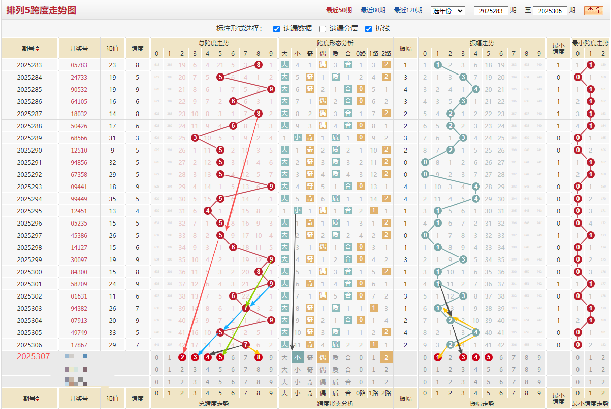 近11期跨度走势5/5/6/9/8/9/6/7/9/5/7,连续11期开出大跨度,本期重点考虑小跨度,从振幅走势黑色线1/2/3对应数字4,黄色线12421走势对应数字8,从左边走势看绿色线9/7/5,蓝色线9/7/5/3,红色线8/5/2都是等隔走下来,本期重点考虑小跨度,307期跨度推荐:23458