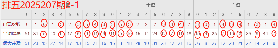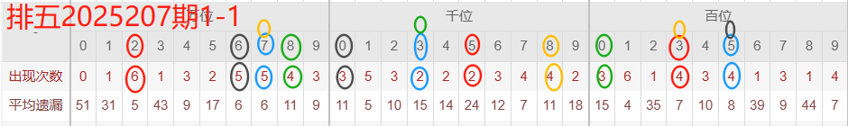 下图所圈出的为近30期各位置所出现的热码出现次数及平均遗漏值,用以参考和一些冷码组合选号。