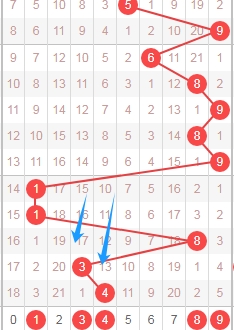 上图是体彩排列五从左到右定位第二位数字走势图,我在上面走势图中标注出来的数字都是遗漏周期小的数字13489,因为你们看最近两期开出的数字都是遗漏周期大的数字,数字4遗漏周期是13期,数字3遗漏周期是17期,那么本期遗漏周期小的数字就可以关注,关注数字13489,个人最看好数字138;