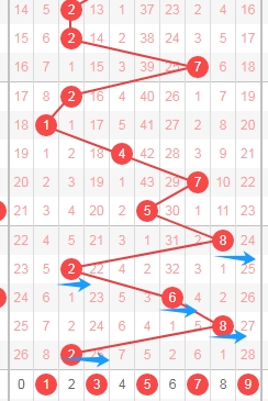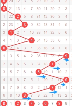 上图是体彩排列五从左到右定位第四位数字走势图,我在上面走势图中标注出来的蓝色小箭头表示的都是奇数,最近连续6期开出的号码都是奇数数字,那么本期个人观点就是关注第四位数字出偶数数字02468;个人最看好数字0246;
