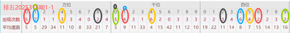 下图所圈出的为近30期各位置所出现的热码出现次数及平均遗漏值,用以参考和一些冷码组合选号。