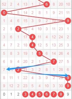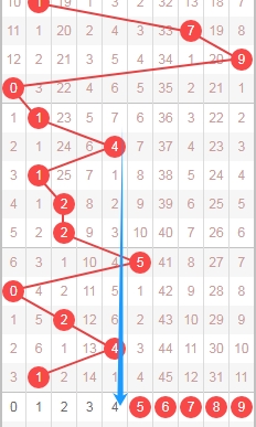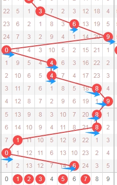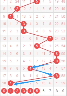 上图是体彩排列五从左到右定位第一位走势图,我标注出来的蓝色大箭头是走势跨度,上期数字8走数字1跨度是7,属于大跨度,那么根据这些跨度来分析的话,本期第一位数字可以关注出小跨度的数字012345,个人最看好数字0134。