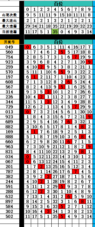 1:百位排序(近100期)开奖号百位0-9个数排序为5237860491 *首选*>>>52378 *次选*>>>60491