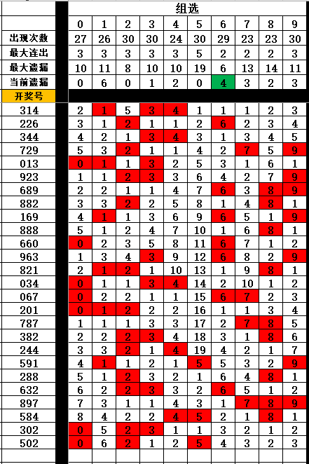 4:组选排序(近100期)开奖号组选各位0-9排序为2359601478 *首选*>>>23596 *次选*>>>01478