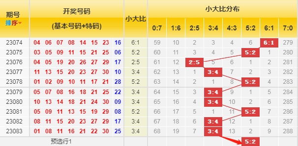 根据计算,上期小数和值20,大数和值89,小大和值差69,看近五期差值分别为60、56、5、65、69,差值以60范围摆动对称,据此趋势下去,再根据小大斜率走势来看,本期小大比预计会移到5:2。