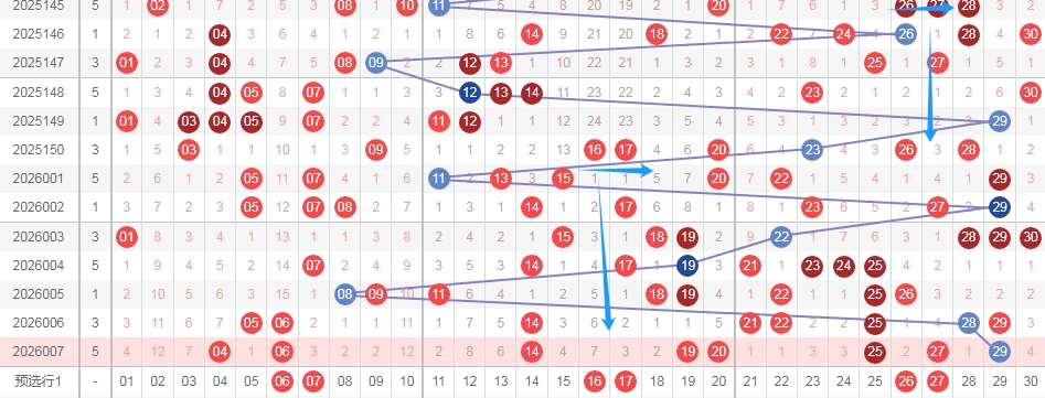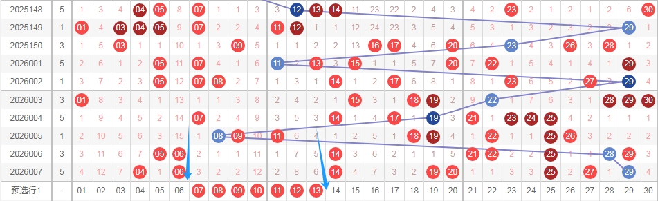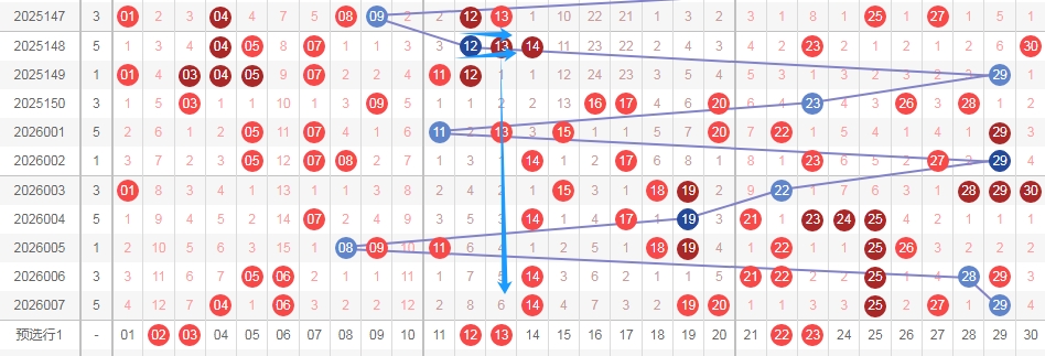 上图是福彩七乐彩开奖号码分布走势图,我在上面走势图中标注出来的数字当成一个区域,这个区域的数字是07 08 09 10 11 12 13看上面走势图中标注出来的蓝色箭头就知道,这个区域的数字连续2期没出现号码,看这个区域其中一部分数字最近都是很冷的,那么本期个人观点,关注这个区域的号码出2个或者3个。