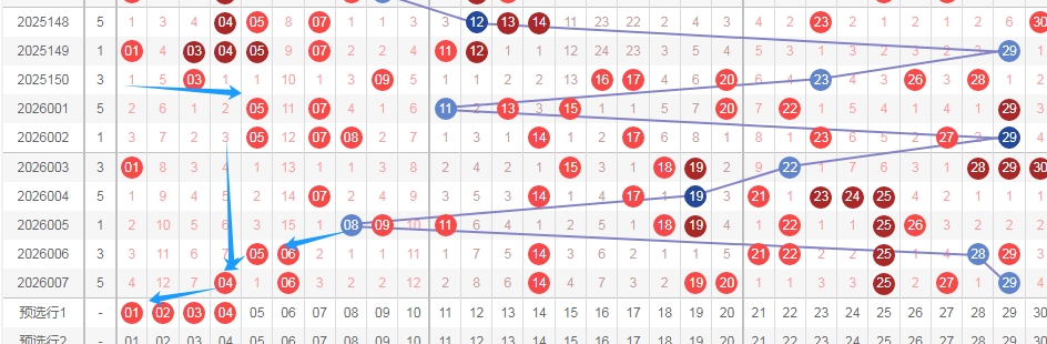 上图是福彩七乐彩开奖号码分布走势图,我在上面走势图中标注出来的数字01 02 03 04把这几个数字当成一个区域,这个区域的数字最近十几期开出的号码并不多,尤其最近几期,上期开出了数字04,那么本期可以关注这几个数字出2个或者3个吧,在看我画出来的蓝色小箭头号码都是往左边去的,所以本期01 02 03 04可以看看出2个或者3个。