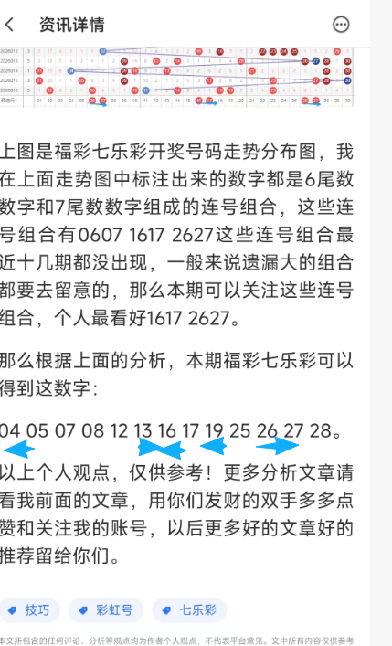 上图是福彩七乐彩开奖号码走势分布图,我在上面标注出来的数字都是2尾数的数字02 12 22,你们看看上面的标注出来的蓝色箭头都是2尾数数字的遗漏周期,最近出现了2尾数的数字出现的太少了,那么本期2尾数的数字可以考虑出1个或者2个,你们看看数字02旁边就是数字04,数字04上期开出,还有数字12旁边是数字13,数字13也是上期开出的,所以本期出2尾数的数字机会是有的。