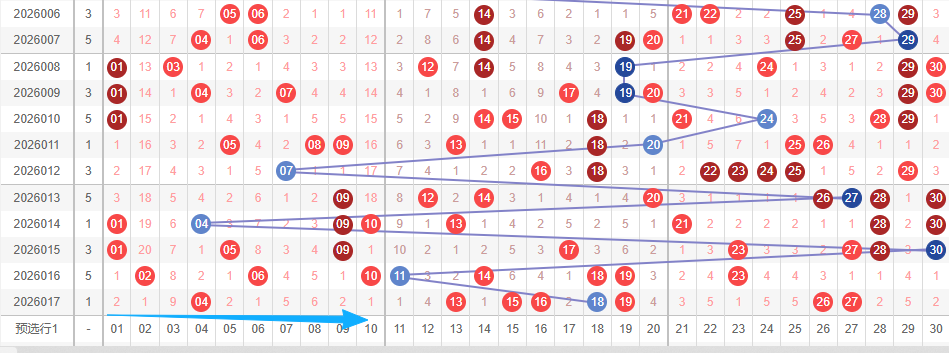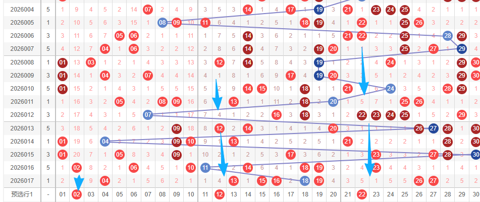 上图是福彩七乐彩开奖号码走势分布图,我在上面标注出来的蓝色箭头,这个区域的数字上期只出现了一个数字04,那么本期可以看这个区域的数字走热,可以看出数字3个或者4个,因为旁边1字头的数字上期出现了4个,有可能会直接反弹变成左边这个蓝色箭头的区域出3个或者4个。