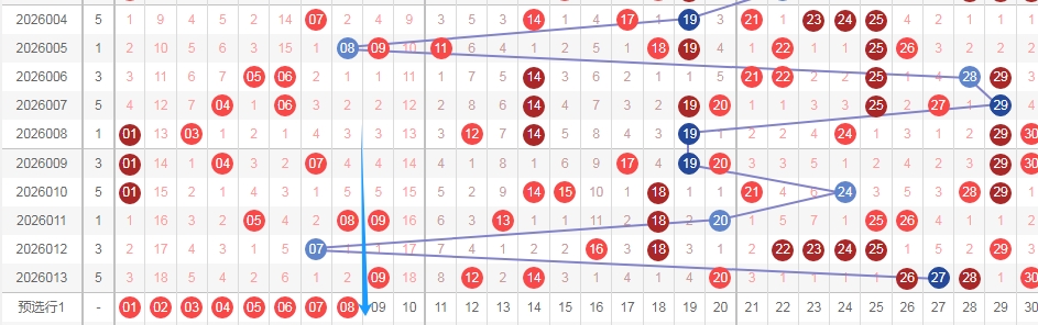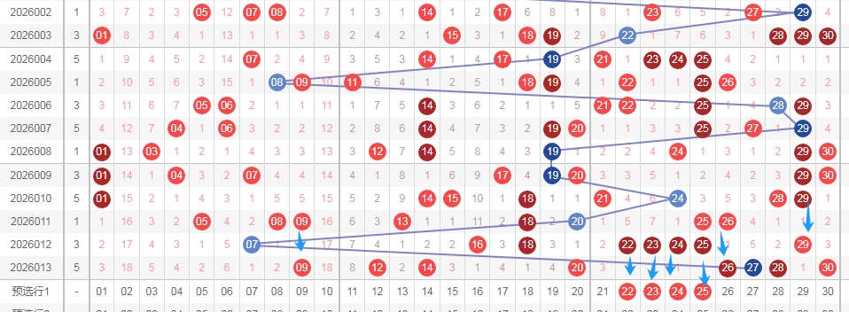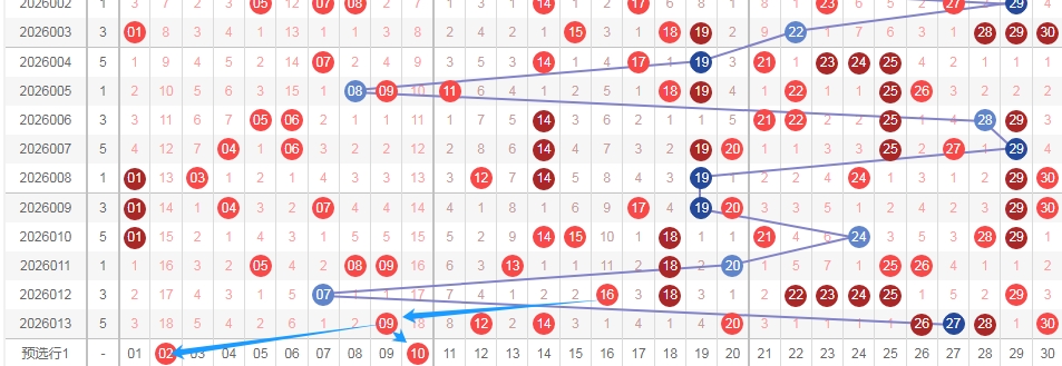 上图是福彩七乐彩开奖号码走势分布图,我在上面走势图中标注出来的蓝色箭头,你们看看蓝色的大箭头那个走势,看那个蓝色箭头,个人觉得02本期应该会出现,其次数字10是上期数字09的斜连号码,还有这两个数字02 10的遗漏周期是目前最大的,那么本期这两个数字我个人觉得至少要出一个或者两个吧,一般遗漏周期大的数字,开出的概率是大的。