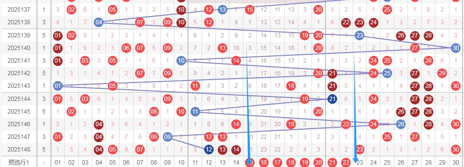 大家好,本人蔡楚门,一个玩彩十几年的老彩民,现在来本平台分享一下本人的对彩票的分析思路和看法,希望本人的文章能够给你们带来灵感和好的运气,首先感谢一起彩提供一个好的平台,下面走势图都是用一起彩平台的走势图,接下来分析一下福彩七乐彩第2025149期的号码思路。下面看蓝色箭头和蓝色圈圈,都是从区域分析或者连号分析还有就是走势分析。