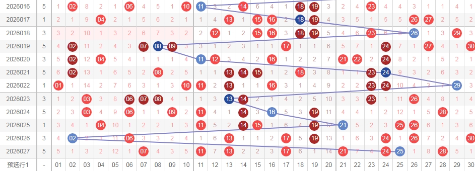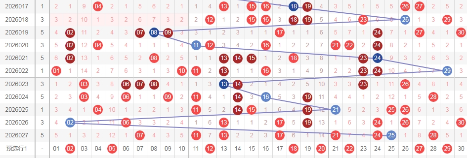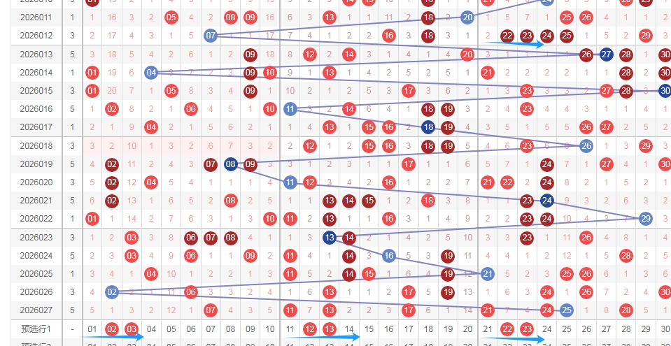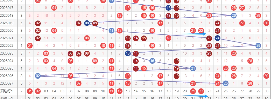 上图是福彩七乐彩开奖号码走势分布图,我在上面走势图中标注出来的数字都是遗漏周期大的数字,因为上期开出的数字出现重复号码3个,隔一期数字一个,隔两期数字一个,都是遗漏周期小的数字,那么本期就关注遗漏周期大的数字,关注数字02 05 12 18 20 22 27 29出2个或者3个吧。