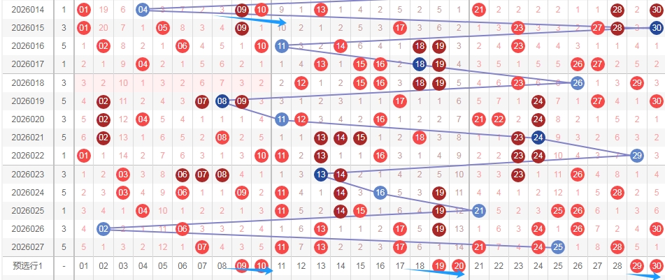 上图是福彩七乐彩开奖号码走势分布图,我在上面走势图中标注出来的数字都是9尾数数字和0尾数数字组成的连号组合,分别是0910 1920 2930这三组连号已经遗漏了13期,上次开出的是上面横向标注出来的蓝色小箭头数字0910,那么本期可以关注这些连号组合出现,因为上期没出现连号组合,所以本期多看连号组合。