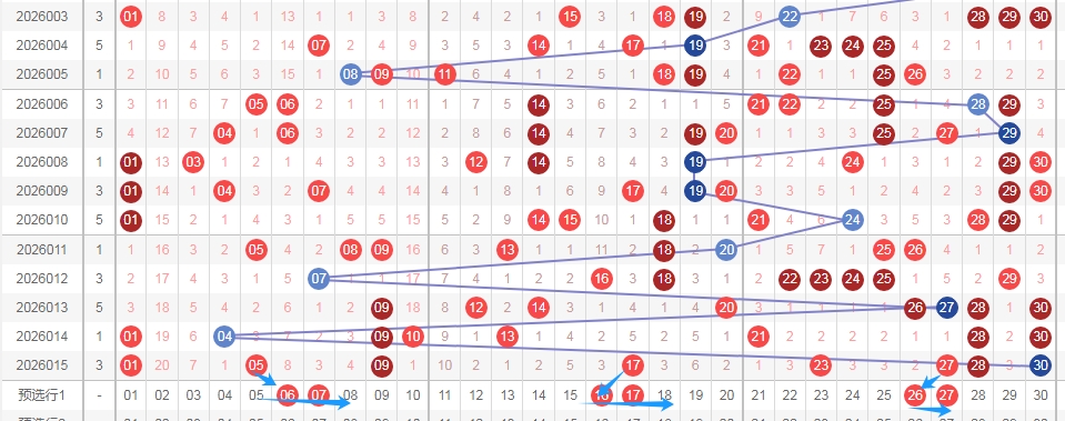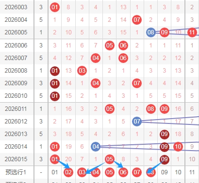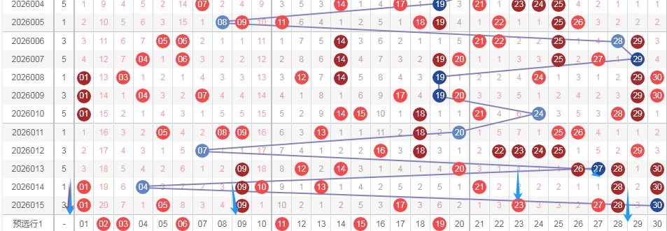 上图是福彩七乐彩开奖号码走势分布图,我在上面走势图中标注出来的蓝色小箭头表示的就是上期开奖号码的遗漏周期,上期出现了3个遗漏周期小的数字,数字01,数字09,数字28这3个数字遗漏周期都是0,数字23遗漏周期是2期,也就是说出了4个遗漏周期小的数字,那么本期遗漏周期大的数字出现的机会就大,本期关注遗漏周期大的数字02 03 06 11 15 19出2个或者3个吧,个人最喜欢数字02 03 06。