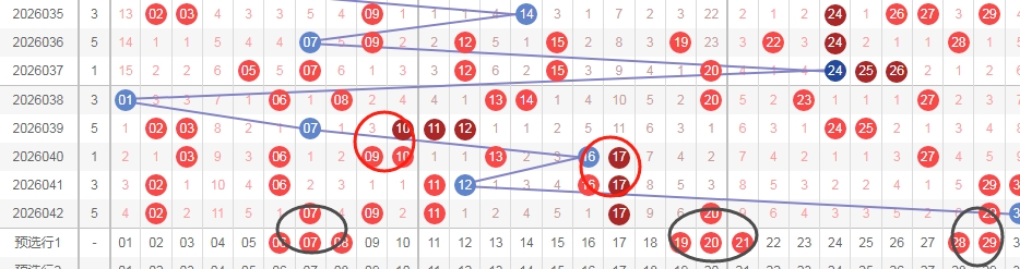 上图是福彩七乐彩开奖号码走势分布图,我标注出来的红色圈圈看看,那些红色圈圈都是前面开出的号码特点,都是一组连号其中一个数字是重复的,像上面连号0910其中数字10是重复的,还有连号1617其中数字17是重复的,那么我们可以按照这个特点去选择号码,那么本期可以考虑连号0607 0708看左边的黑色圈圈,在看连号1920 2021看中间的黑色圈圈,在看右边的黑色圈圈2829连号,这些黑色圈圈里面的都是连号,而且连号其中一个数字是重复的。