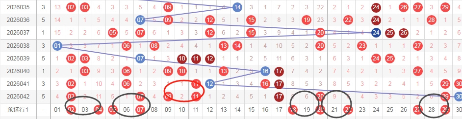 上图是福彩七乐彩开奖号码走势分布图,我标注出来的红色圈圈看看,那些红色圈圈都是前面开出的号码特点,都是一组跨度二组合其中一个数字是重复的,像0911跨度二组合其中数字11是重复的,那么按照这个组合特点,本期看看黑色圈圈,可以考虑0204,0507,1820,2022,2729这些都是跨度二组合而且其中一个数字都是重复的。