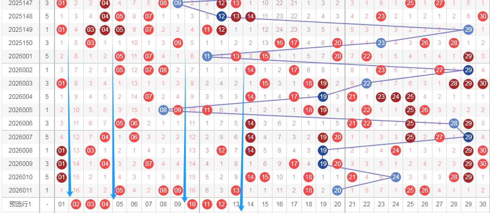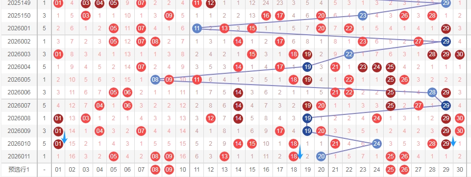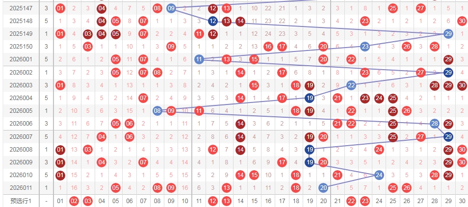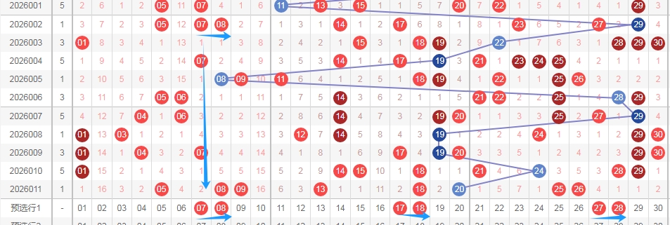 上图是福彩七乐彩开奖号码走势图分布图,我在上面走势图中标注出来的蓝色小箭头都是重复趋势,上期只出现了一个重复号码,上上期出现了两个重复号码,也就是说最近两期出重复号码个数少,那么本期大家要留意出重复号码数字,个人观点就是上面走势图中标注出来的数字08 09 25 26至少要出1个或者2个吧。